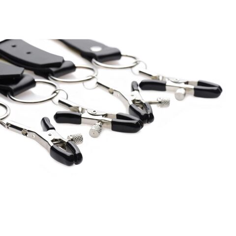 Увеличьте интенсивность своих самых извращенных сцен с помощью этих уникальных ремней, предназначенных для того, чтобы обернуть их вокруг бедер, зажать половые губы и раздвинуть их! Этот уникальный набор идеально подходит для доминантных игр, гинекологических ролевых игр, медицинского фетиша или любых других жестких фантазий, которые вы хотите воплотить в жизнь. Он сделает гениталии вашей партнерши сверхчувствительными и беспомощными, как никогда раньше. Ремни имеют бархатистую мягкую внутреннюю подкладку и оснащены пряжками для регулировки посадки на бедрах. Зажимы с резиновыми наконечниками оснащены винтами, которые регулируют их давление. Проявите творческий подход к своим сценариям БДСМ! Размер ремней регулируется от 40,6 до 71 см.