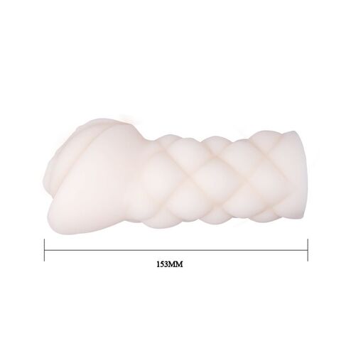 Мастурбатор вытянутой формы удобно держать в руках, что позволяет самостоятельно регулировать интенсивность и темп движения полового органа во влагалище. Диаметр тоннеля в первоначальном состоянии – 1 см.