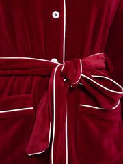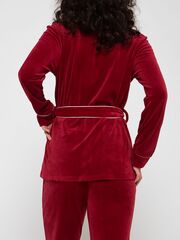Бесподобный роскошный домашний костюм: жакет и брюки. Выполнен из трикотажного бархатного велюра поистине королевского цвета. Особенно изысканно этот цвет смотрится в сочетании с белым атласным кантом, который присутствует в отделке костюма, и перламутровыми пуговицами. Брюки прямого силуэта, на резинке. Жакет с английским отложным воротником, накладными карманами, мягким поясом. В комплекте: жакет, брюки.