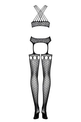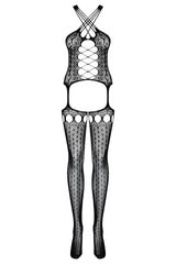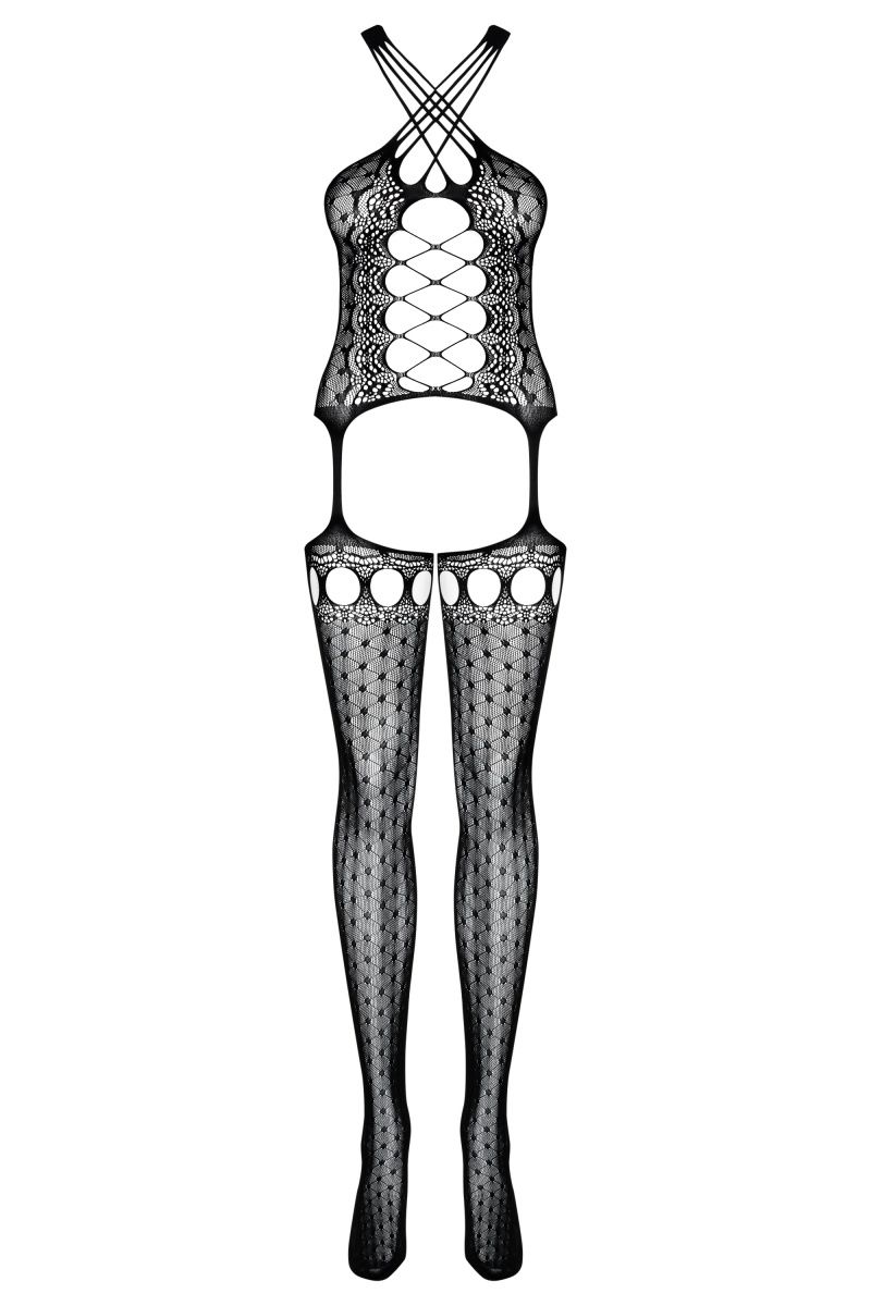 Откровенный комбинезон-сетка. С интимным доступом. Комбинезон с имитацией чулок, бретели перекрещены через шею, в области декольте имитация шнуровки.