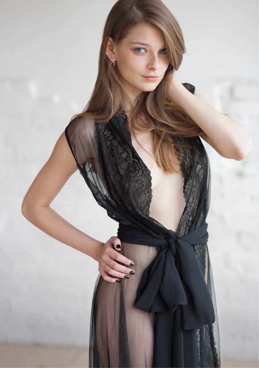 Роскошный халат из сетчатой ткани украшен кружевом. Широкий пояс из этой же ткани подхватывает талию. От обнаженного тела, прикрытого полупрозрачной тканью, захватывает дух.