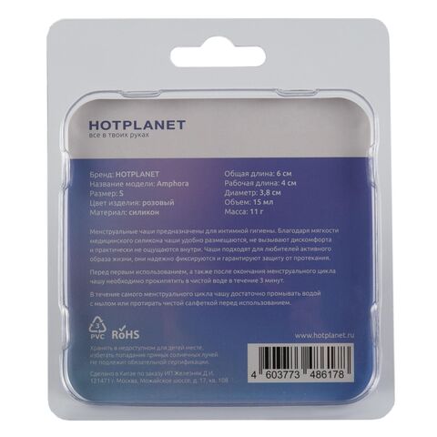 Hot Planet Amphora — менструальная чаша из мягкого медицинского силикона, гигиеничного и безопасного для здоровья. Чаша удобно размещается внутри и не вызывает никакого дискомфорта. Она абсолютно незаметна под любым бельем и совсем не ощущается. С Amphora вы можете заниматься спортом, плаванием, посещением спа и не бояться протеканий.