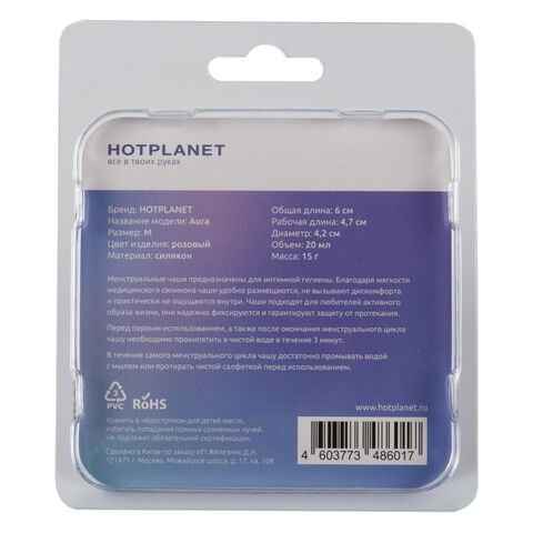 Hot Planet Aura — менструальная чаша из мягкого медицинского силикона, гигиеничного и безопасного для здоровья. Чаша удобно размещается внутри и не вызывает никакого дискомфорта. Она абсолютно незаметна под любым бельем и совсем не ощущается. С Aura вы можете заниматься спортом, плаванием, посещением спа и не бояться протеканий.