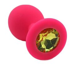 Анальная пробка из силикона розового цвета, размер M. Страз в основании круглой формы, выполнен из стекла желтого цвета. Упакована в вельветовый мешочек для хранения. Вес - 46,5 граммов.