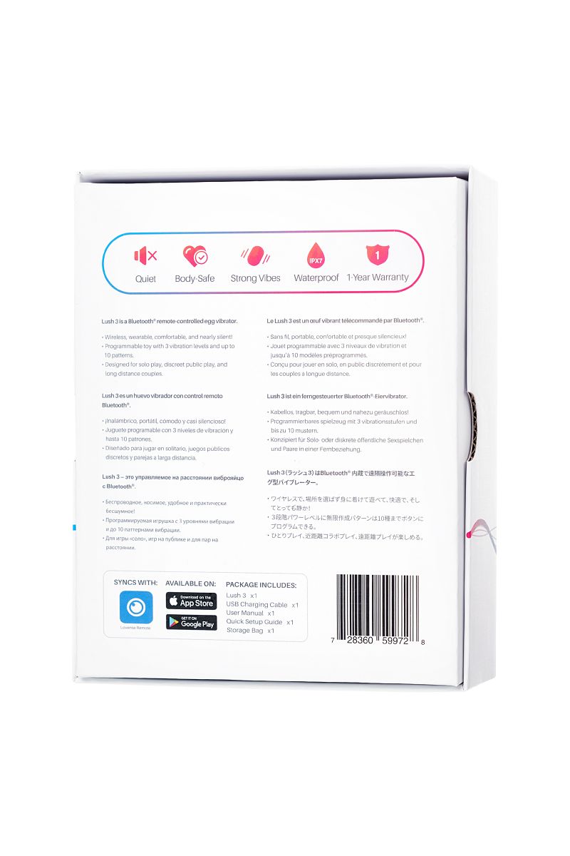 Lush 3 - это последняя версия всемирно известного виброяйца с дистанционным управлением с некоторыми существенными улучшениями, такими как фиксированный хвост, который обнимает тело и гарантирует, что игрушка будет оставаться в нужном месте и обеспечивать более глубокие вибрации на точке G, улучшенный аккумулятор и переработанная антенна Bluetooth. Рабочая длина - 7,6 см.