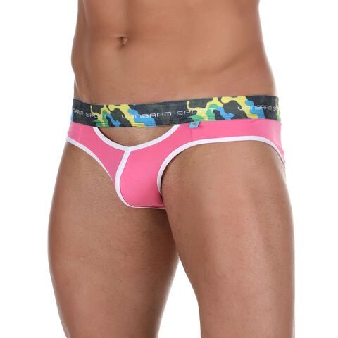 Розовые мужские трусы-слипы с пикантными вырезами под поясом.