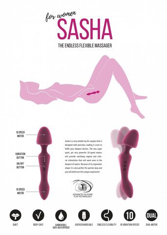 Очень гибкий вибратор из медицинского силикона, который быстро достигает температуры тела. Идеально подстраивается под формы вашего тела. Очень тихий и мощные два моторчика с десятью режимами вибрации. Диаметр головки - 4,5 см.