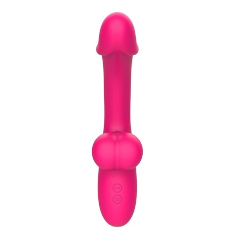 Розовый изогнутый вибромассажёр с имитацией мошонки. 10 режимов вибрации. Рабочая длина - 11 см.