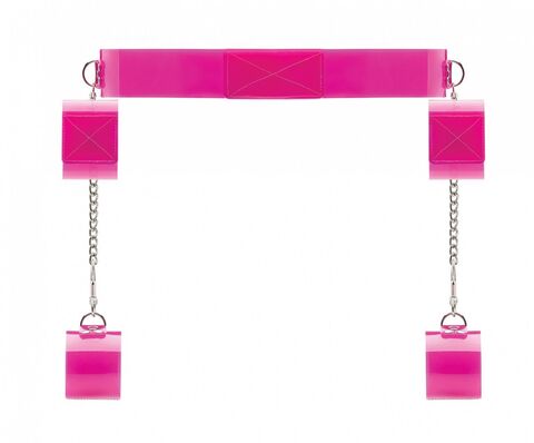 Яркий и смелый комплект из ошейника и наручников. Материал изготовления- ПВХ. Размер легко регулируется при помощи застежек. Пара оков попарно крепятся карабинами к ошейнику. Размер оков также регулируется липучкой. Ширина ошейника - 5 см.