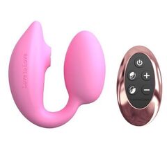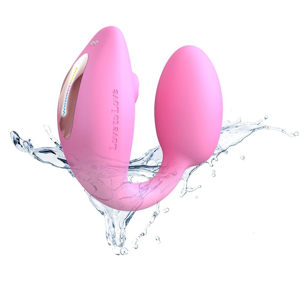 Двойной стимулятор точки G и клитора с имитацией оральных ласк и дистанционным управлением с пульта Wonderlover. Вибрирующее погружное яйцо + силиконовый «лепесток», покрывающий вульву и в нем дополнительно посасывающая стимуляция в области головки клитора.