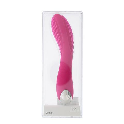 Розовый вибратор с поверхностью-щёточкой OLINA PINK. Водонепроницаемый. 20 ритмов вибрации и ротации. Кабель для USB-зарядки в комплекте.