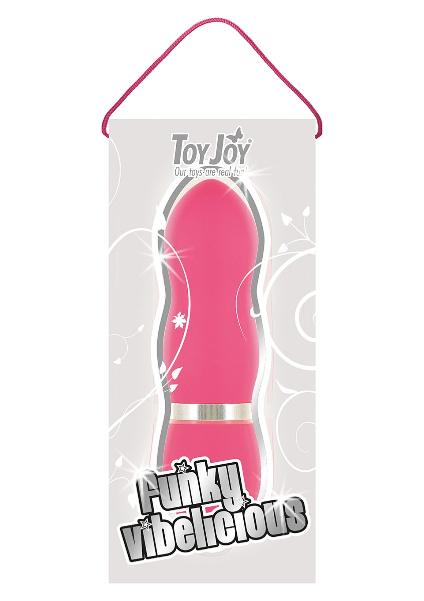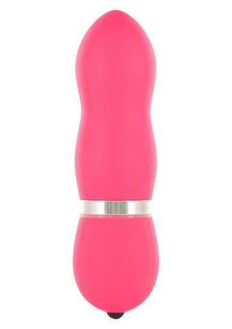 Небольшой вибратор розового цвета рельефной формы. Включается с помощью кнопки,расположенной у основания игрушки.