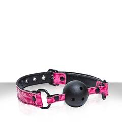 Дышащий пластиковый кляп с регулируемым ремнем крепления из розового винила с формовым рисунком. Шарик имеет отверстия для облегченного дыхания. Диаметр шарика - 4 см.