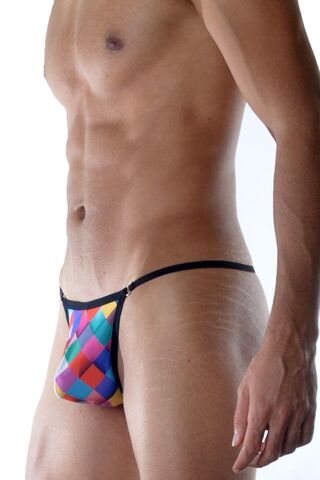 Сексуальные трусы-стринги с принтом в виде цветных квадратов.