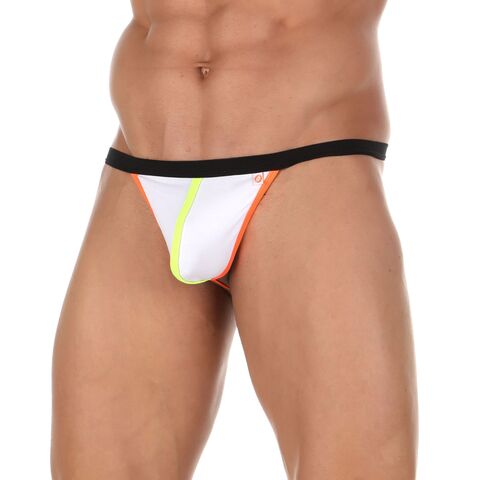 Сексуальные трусы-стринги с салатовой и оранжевой окантовкой.