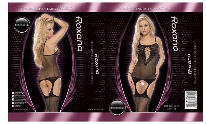Костюм-сетка (сплошной костюм: топ без рукавов и чулки черного цвета). Топ украшен орнаментом и вырезом со шнуровкой в зоне декольте.