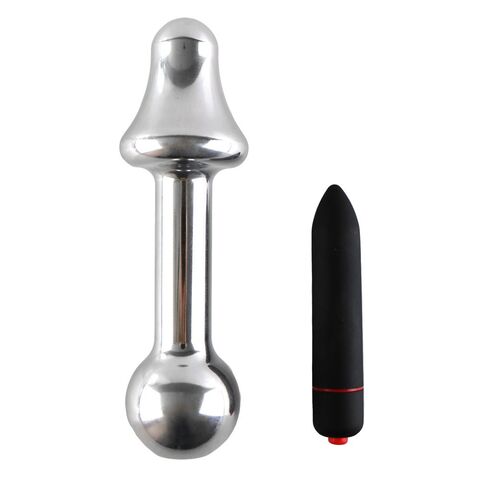 Серебристая анальная пробка AH T1 с вибрацией. Съемный виброэлемент. 7 режимов вибрации.