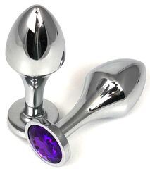 Серебристая анальная пробка на удлиненной ножке с фиолетовым кристаллом - 9 см.