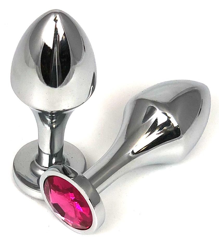 Серебристая анальная пробка на удлиненной ножке с розовым кристаллом - 9 см.
