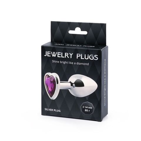 Серебристая анальная пробка с фиолетовым кристаллом-сердечком - 8 см.