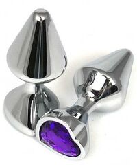 Серебристая анальная пробка с фиолетовым кристаллом-сердцем - 8 см.