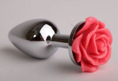 Серебристая анальная пробка с красной розочкой - 8 см.