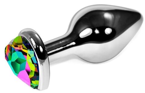 Серебристая анальная пробка с разноцветным кристаллом-сердечком - 6,8 см.