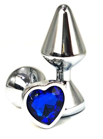 Серебристая анальная пробка с синим кристаллом-сердцем - 8 см.