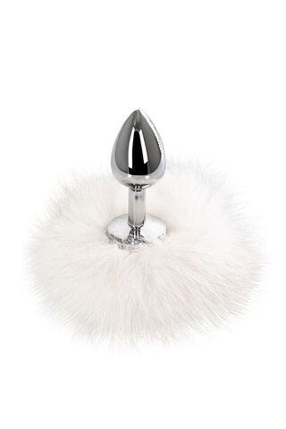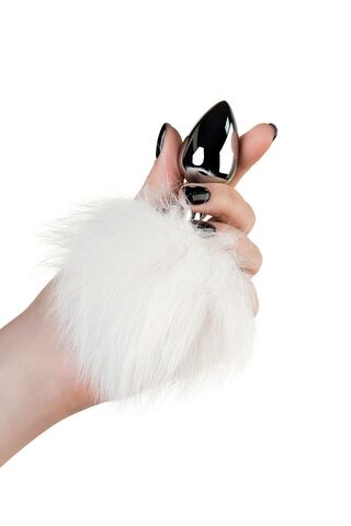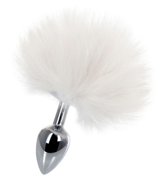 Серебристая анальная втулка с белым заячьим хвостом. Рабочая длина - 6,5 см.