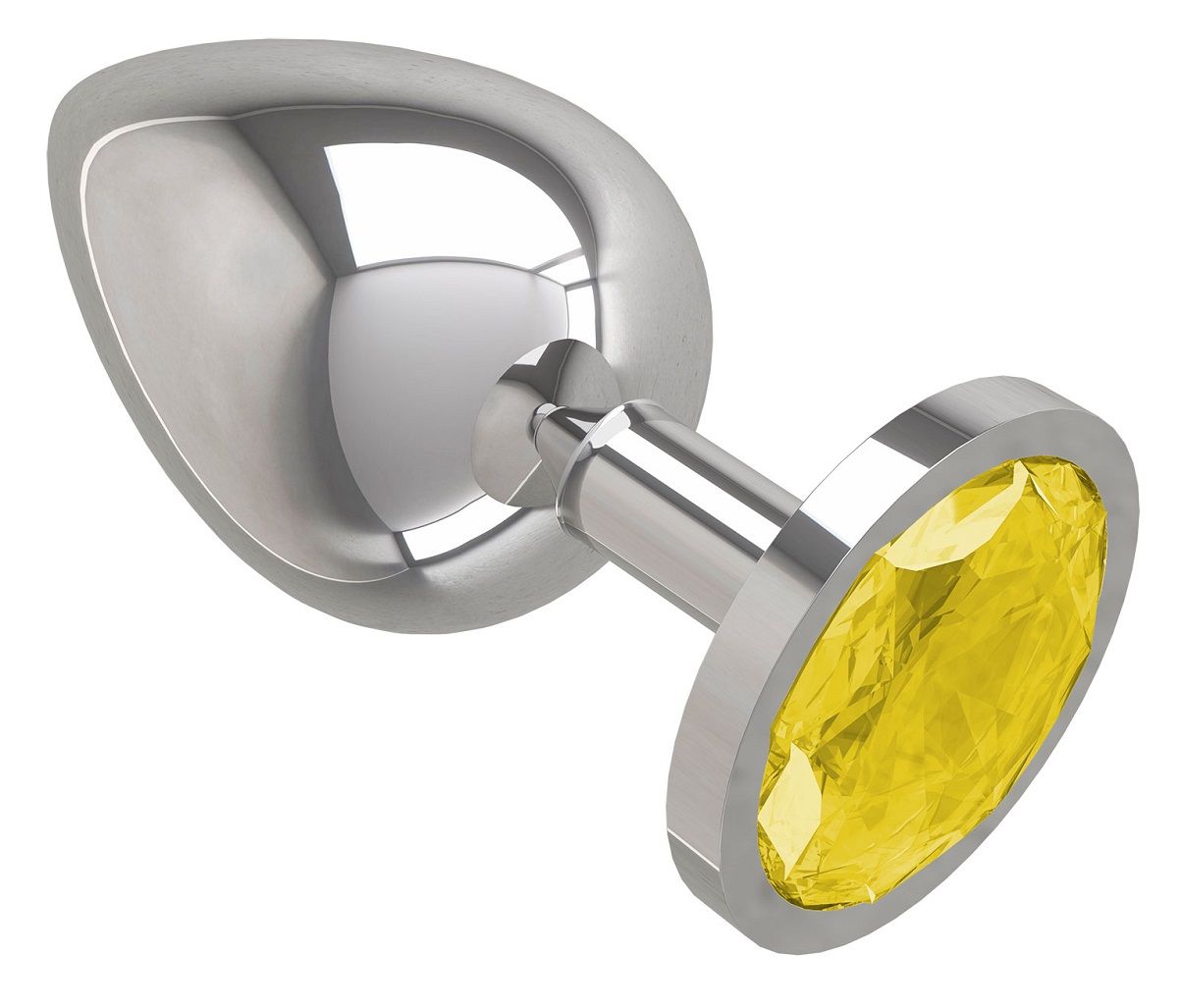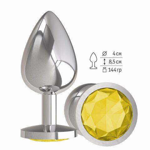 Серебристая большая анальная пробка с желтым кристаллом - 9,5 см.