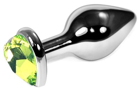 Серебристая коническая анальная пробка с лаймовым кристаллом-сердцем - 9 см.