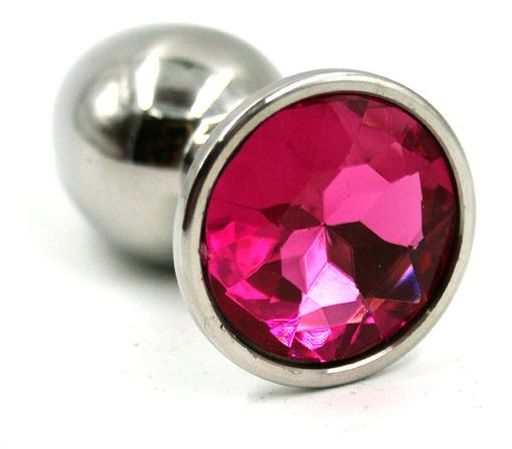 Серебристая малая анальная пробка с ярко-розовым кристаллом - 7 см.