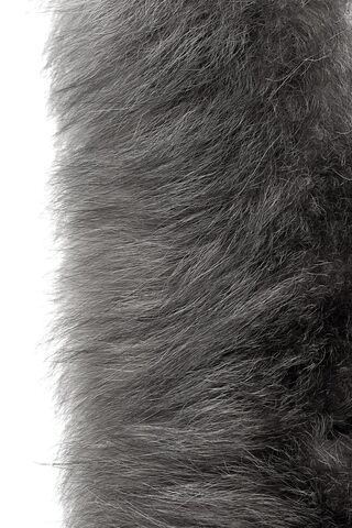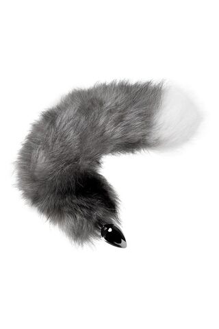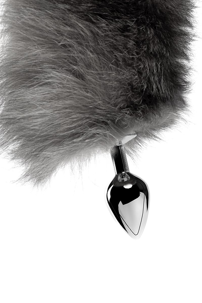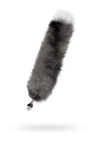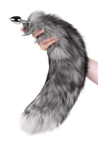 Серебристая металлическая анальная втулка с серым лисьим хвостом. Длина с хвостом - 34 см.