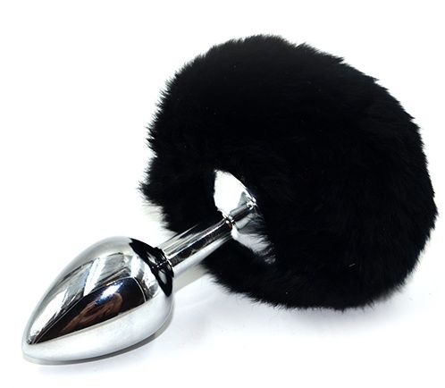 Серебристая округлая анальная пробка с заячьим хвостиком черного цвета - 11,5 см.