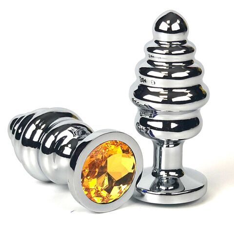 Серебристая ребристая анальная пробка с оранжевым кристаллом - 8 см.