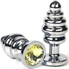 Серебристая ребристая анальная пробка с желтым кристаллом - 8 см.