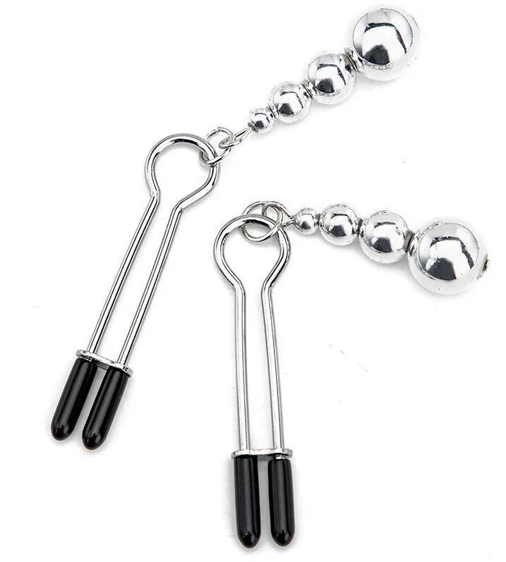 Зажимы на соски с подвеской из бусин и страз служат дополнительным стимулятором одной из самых чувствительных зон. Включают в себя 2 полностью регулируемых многофункциональных зажима. Имеют мягкие наконечники и подвески из бусин и страз, которые одновременно служат украшением и своеобразным утяжелителем для дополнительных ощущений.