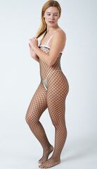 Комбинезон-сетка с вырезом open crotch. Прямоугольный вырез, декорированный кружевом. Белье обработано феромонами.