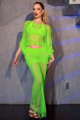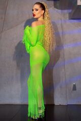 Комплект из мягкого эластичного материала разного плетения: топ из сетки с рукавами и бахромой, лиф-топ с бретелью на шее, длинная юбка с бахромой по нижнему краю. В комплекте: топ, лиф, юбка.