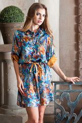 Оригинальная удлиненная рубашка средней длины прямого силуэта из натурального шелка с фантазийным принтом. Рубашка с рукавом реглан, манжета двухсторонняя, на рукаве хлястик застегивающийся на пуговицe с петлей, для корректировки длины рукава. Модель с полукруглым низом и разрезами по бокам. Модель имеет втачной воротник на стойке с планкой. Приталенный силует создается за счет кулиски и пояса.