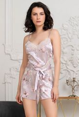 Комбидресс на тонких бретелях, выполнен из принтованного смесового шелка. Ажурное кружево украшает вырез и бока комбидресса. Декор - атласный бантик с подвеской по центру выреза. Линию талии можно подчеркнуть за счет пояса, который идет в комплекте.