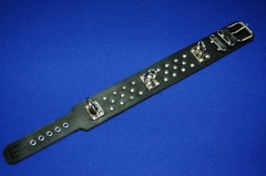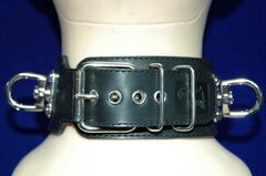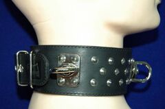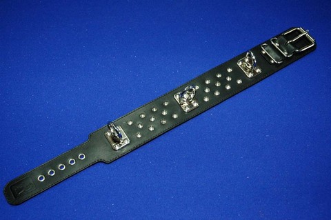 Ошейник подшитый. Застежка- ремешок с пряжкой. Декорирован металлической фурнитурой. Имеет вращающиеся металлические кольца для крепления поводков, лент, веревок и других элементов бандажа. Ошейник в BDSM может иметь различные назначения. Он может использоваться в качестве антуража для создания образа. Может использоваться в практическом назначении как один из связующих элементов бандажа. А самое главное - он имеет глубокое психологическое значение, так как ошейник это основная эмблема подчинения и наказания.