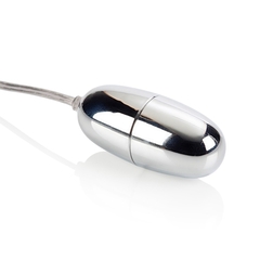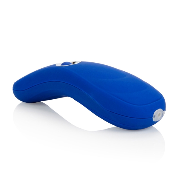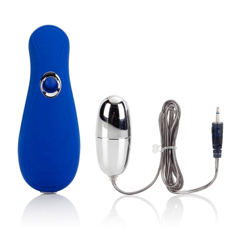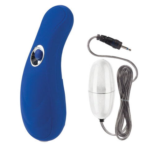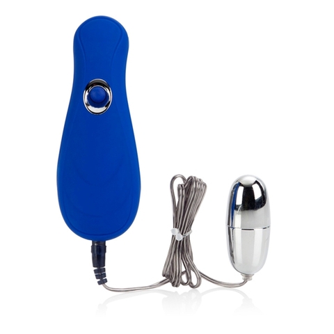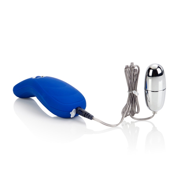 Вибростимулятор синего цвета с выносным пультом. Имеет одну вибропулю для стимуляции различных эрогенных зон. Имеет 10 функций вибрации, пульсации и эскалации, переключающиеся при помощи удобной кнопки на пульте. Вибропулю можно отсоединить и использовать игрушку как массажер для тела. Изготовлен из пластика, покрытый бархатистым сатиновым покрытием.