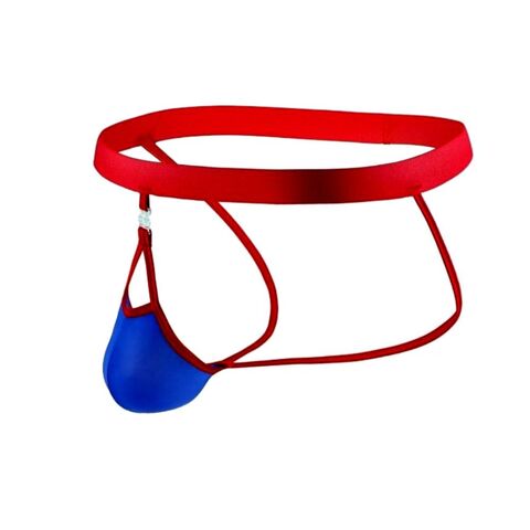 Синие сексуальные трусы-джоки на тонких красных ремешках.