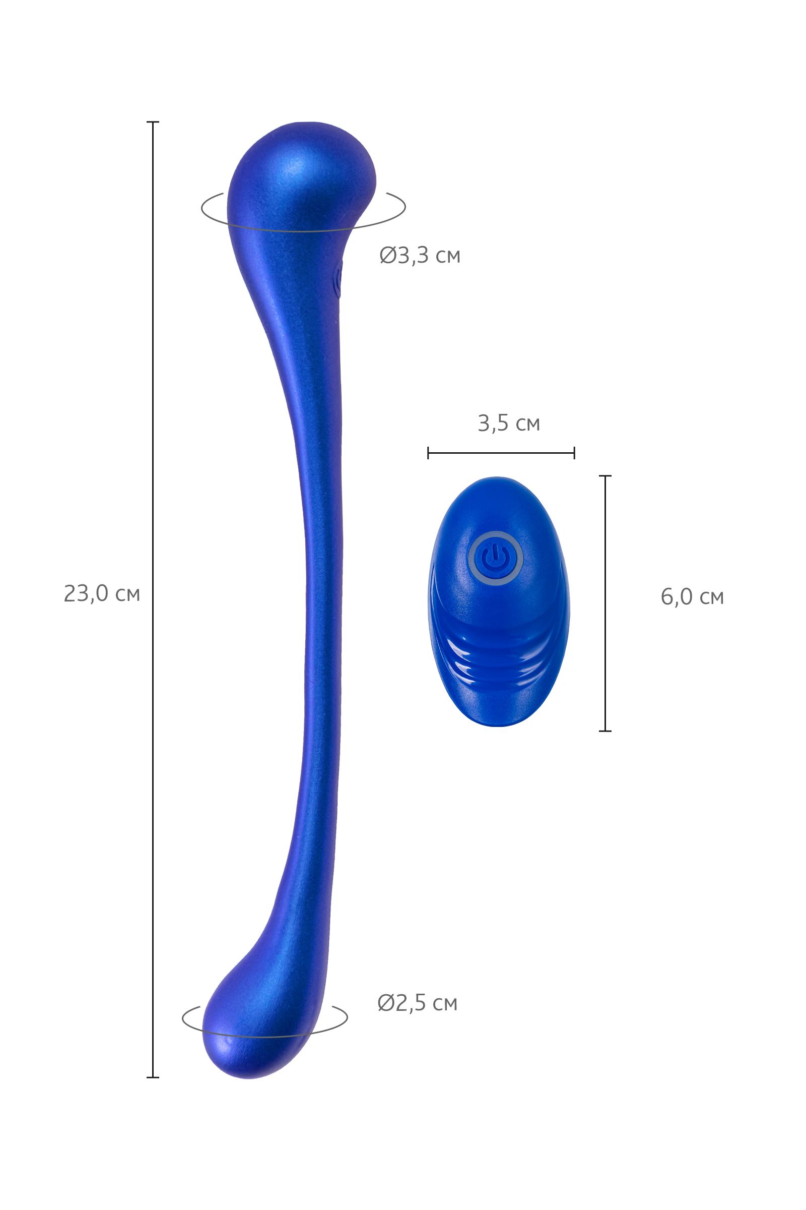 С пульта: Включи вибратор и управляй им, переключая режимы вперед-назад и ставя паузу в нужные моменты. Диаметр кончиков - 3,3 и 2,5 см.