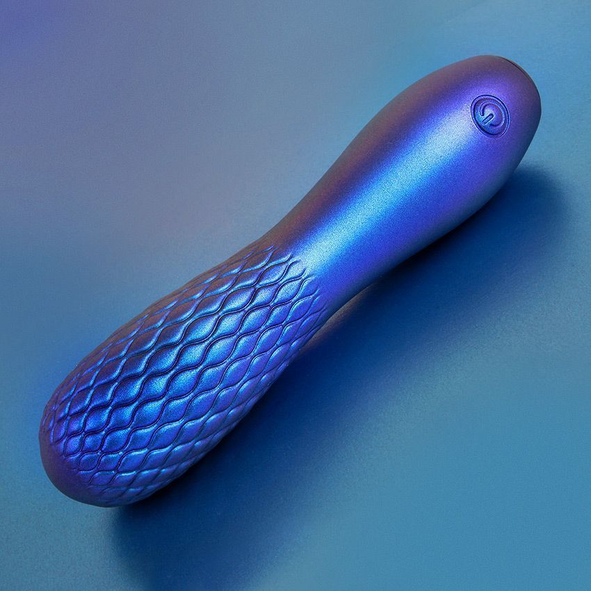 Синий вибромассажер с рельефной головкой. 10 режимов вибрации. Перезаряжаемый.