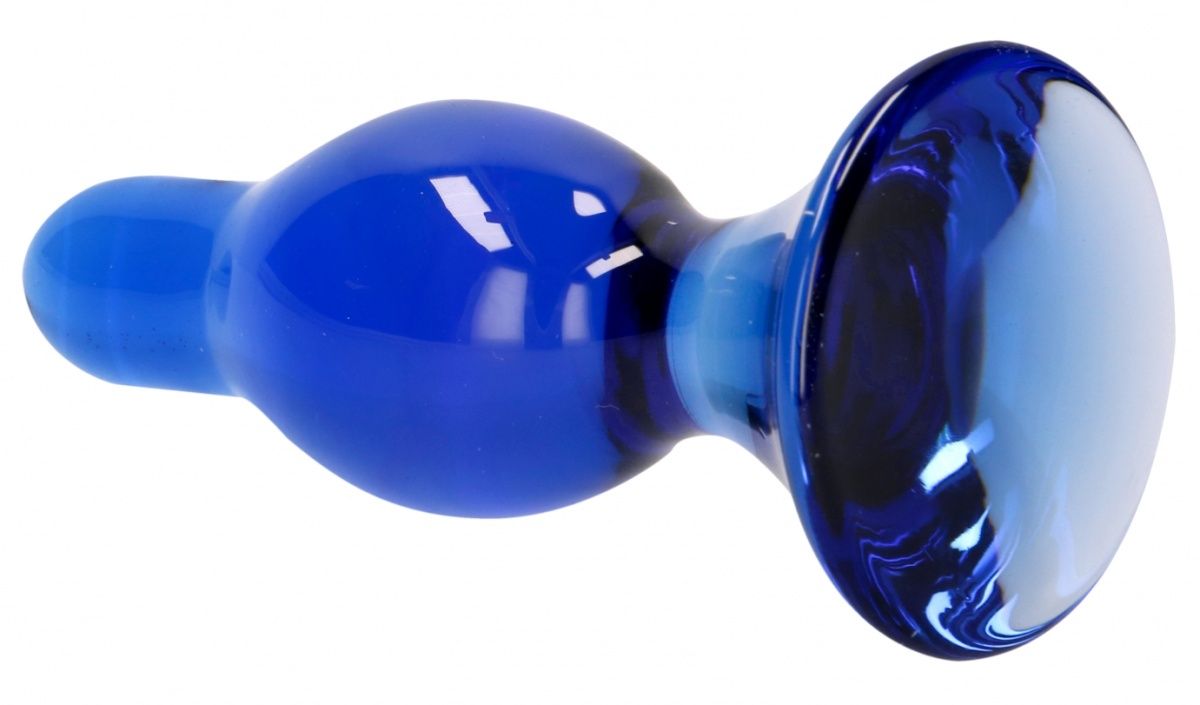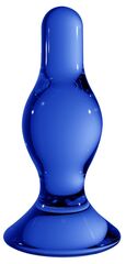 Стеклянный анальный стимулятор тёмно-синего цвета с рельефным дизайном. Поместите пробку под теплую или холодную воду, и боросиликатный материал нагреется или охладится. Ручная работа, небьющаяся игрушка. Рабочая длина - 8,5 см.