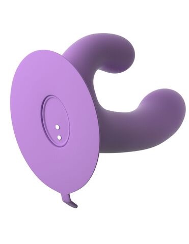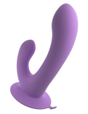 Сиреневый перезаряжаемый вибратор с клиторальным отростком Duo Pleasure Wallbang-Her. 11 функций вибрации. Присоска в основании. Рабочая длина - 12,7 см.