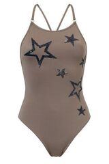 Слитный купальник. Декорирован звездами из пайеток. На спине завязывается перекрещенными бретелями.