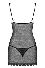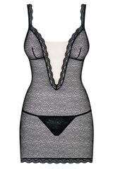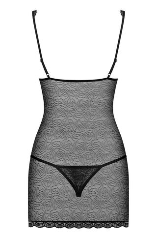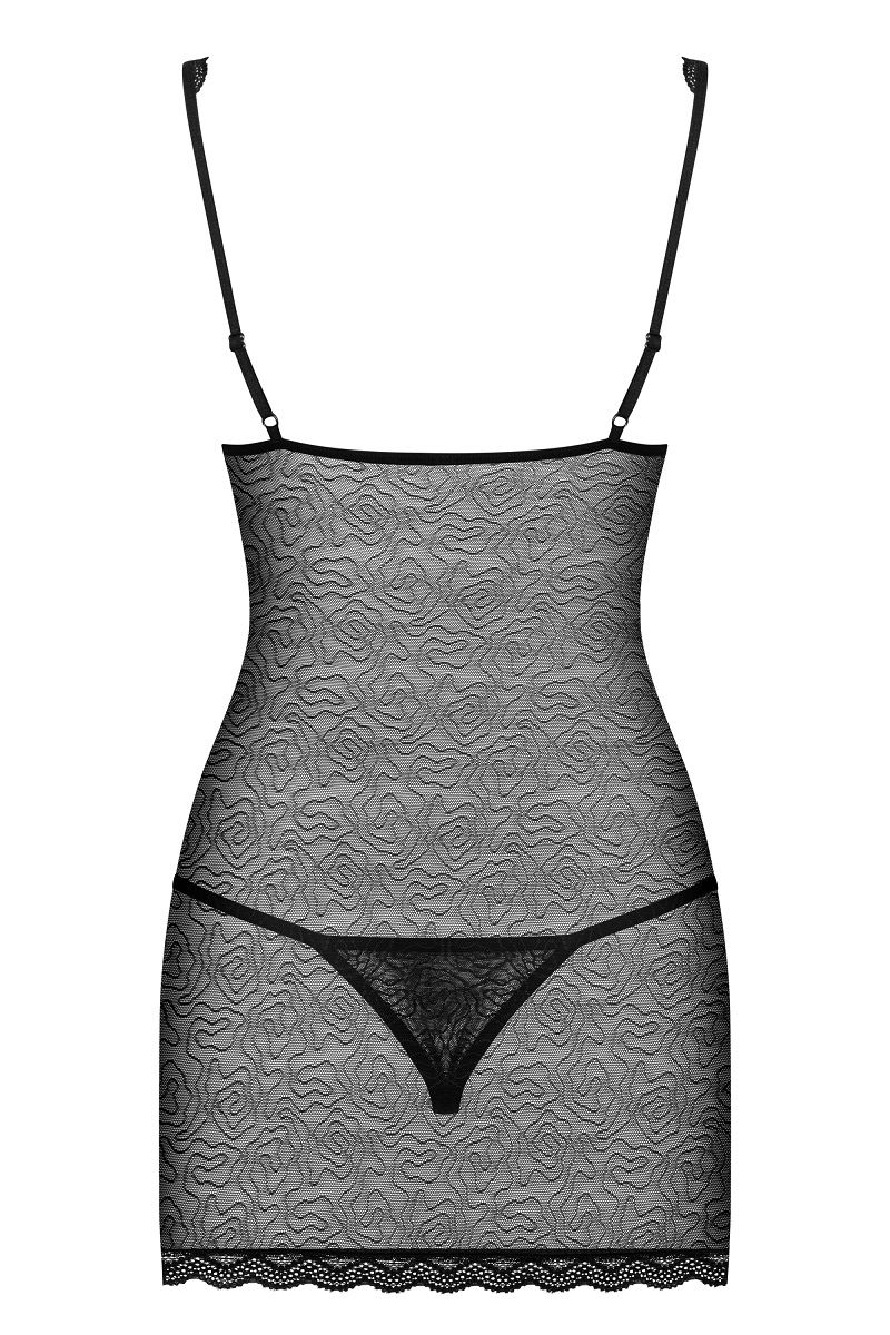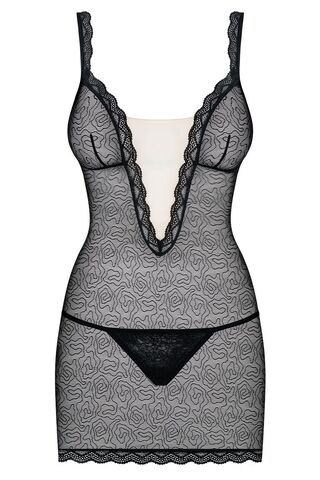 Соблазнительная сорочка из двух видов материала. Глубокий V-образный вырез декольте. Изысканное кружево с завитками. Регулируемые бретели. В комплекте: сорочка, трусики-стринги.